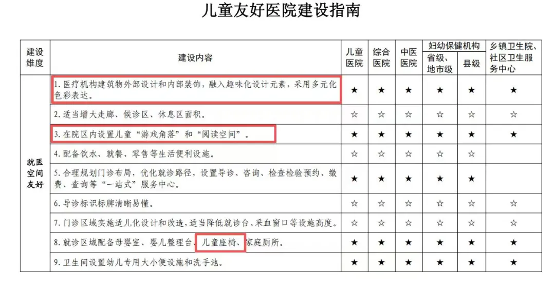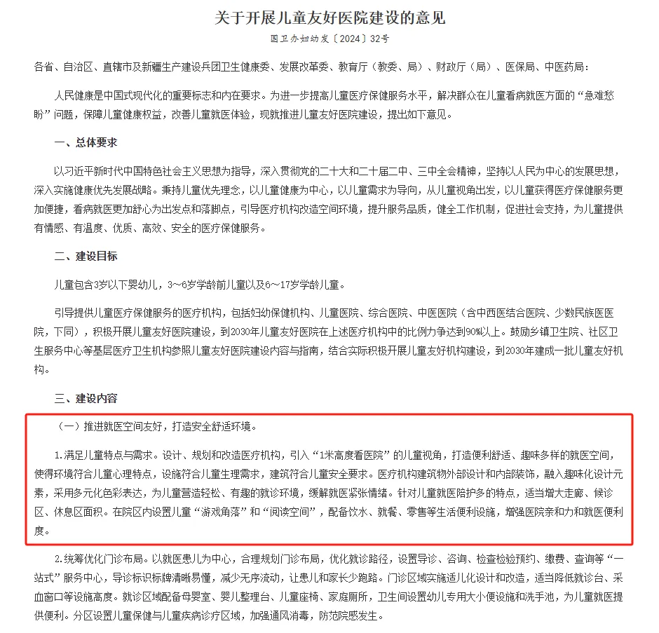 在《关于开展儿童友好医院建设的意见》中,明确提出了“推进就医空间适儿化改造、提供优质医疗护理服务、营造温馨友好氛围”三大核心要求;