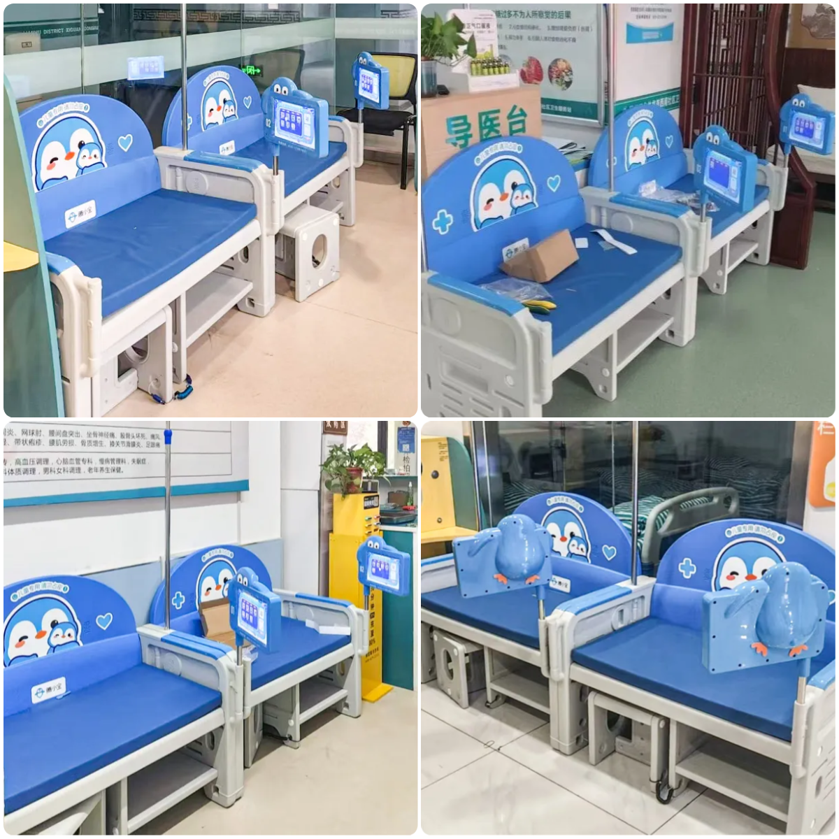 腾小宝智能儿童输液椅以可爱的企鹅为主设计元素,搭配柔和的蓝色,营造温馨可爱的柔和氛围,视觉上降低儿童的紧张感。
